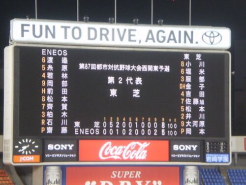 昨日MHPSが一抜けしたことにより残りの1枠を東芝とJX-ENEOSで争うことになった今日の試合、先発は善と柏原。5年前の夏 以来のハマスタでの大役を任された柏原は初回3人で抑えるも、2回に金子のセンター返しを若林止めるも内野安打、佐藤旭三遊間を破るレフト…