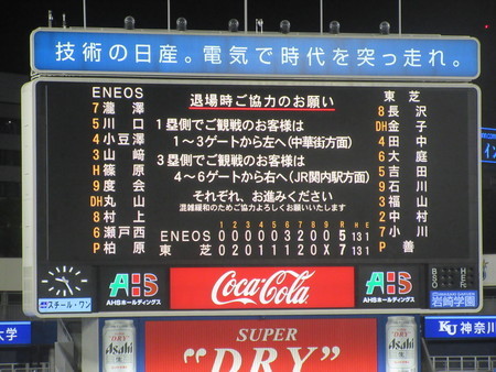 3年ぶりに有観客・応援有りの西関東予選がハマスタに戻ってきました。ENEOSが関根、東芝が吉村の両エースの先発で始まった代表決定リーグ初戦は2回裏に東芝がヒットの石川を1塁に置き、福山のライトポール際への2ランで先制。4回には吉田の遊ゴロを瀬戸西がフワッと謎のワンバン送球、ファーストの山﨑も捕れずエラーとなると、ヒットと四球で1死満塁から中村の犠飛で3点目を挙げ関根をKO。2番手の加藤からも5回吉田が犠飛を放ち4点目、ここまでは完全に東芝ペースで進みます。